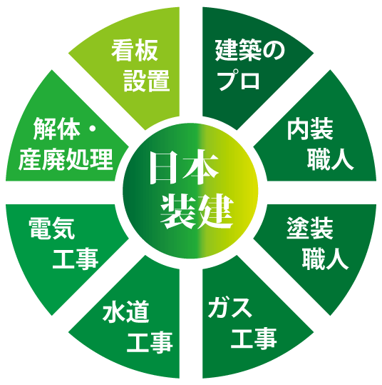| 私たちは、建物や住宅のお困りごとはすべて解決できる住宅のプロ集団です。 新築住宅、住宅・マンションの内装のリフォーム、水回りや電気まわりのリフォーム、外壁や屋根などの外回りの改修工事、解体工事など、あらゆることに対応が可能です。 まずは一度、ご相談ください。 お客様にとって一番いい方法をご提案いたします |